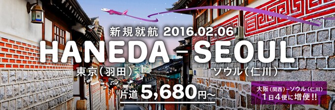 | 東京(羽田)-ソウル(仁川) | 3,990円 (全曜日適用) |