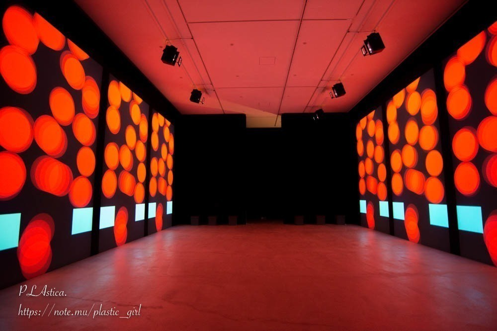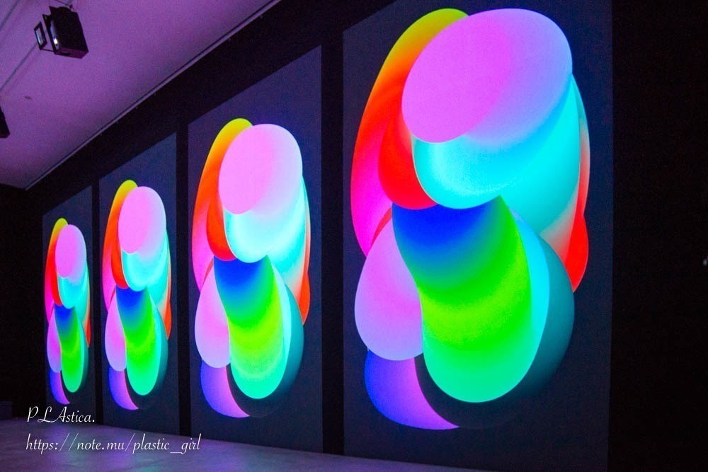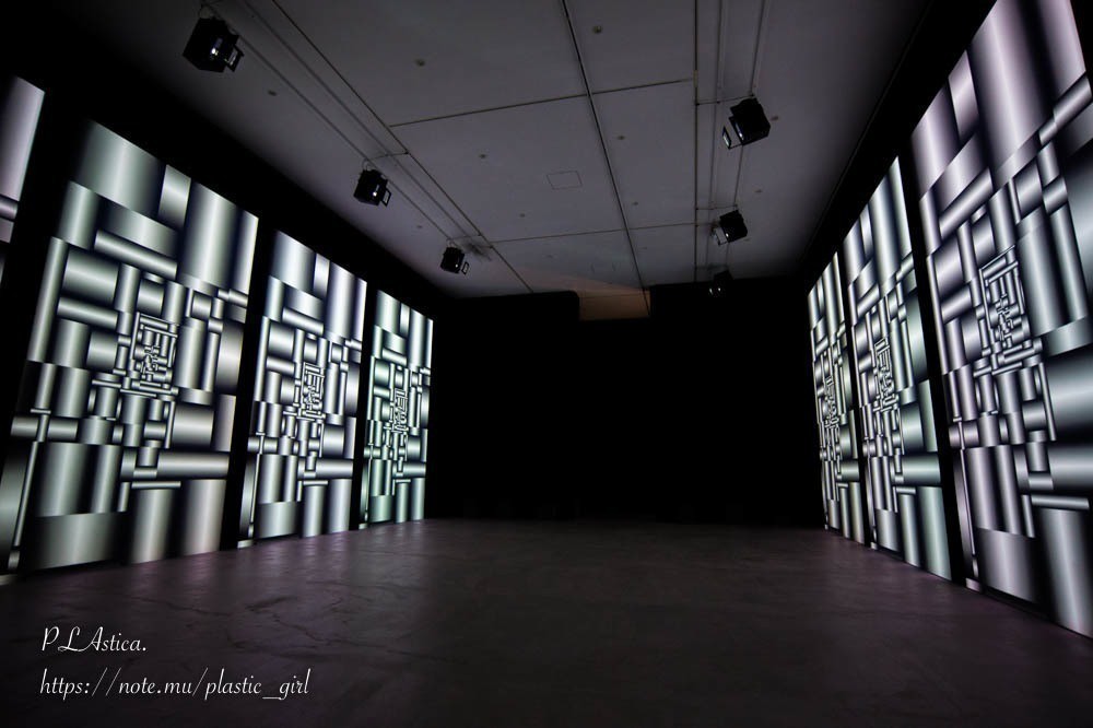 映し出されているのは、カラフルで延々とリピートされる”スクリーンセーバー”のようなアニメーション。意味のない幾何学的でランダムなデザインだと思いながら見ていると、ふとした瞬間にそれが具体的な物体がモチーフであることに気づいたり。