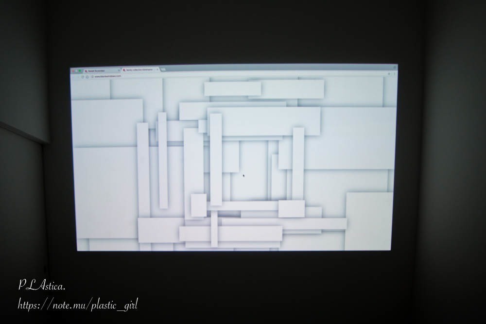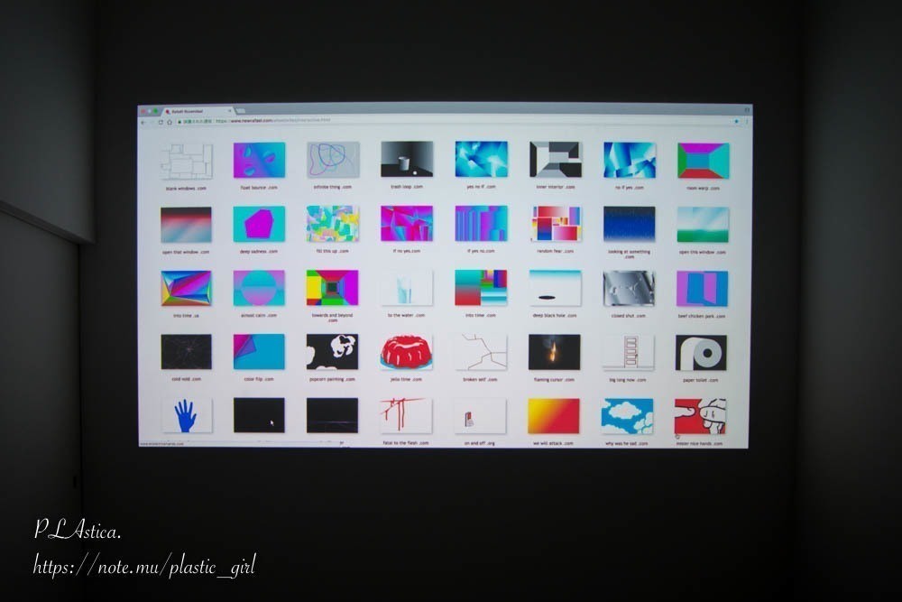 大・中・小、3つの展示室が長くて明るい廊下で繋がれているのがユニークな十和田市現代美術館ですが、まず、はじめの大きな展示室には、展示室の全体がスクリーンとなった映像作品「Looking at Something (Selected Websites)」(2006-2018)が。