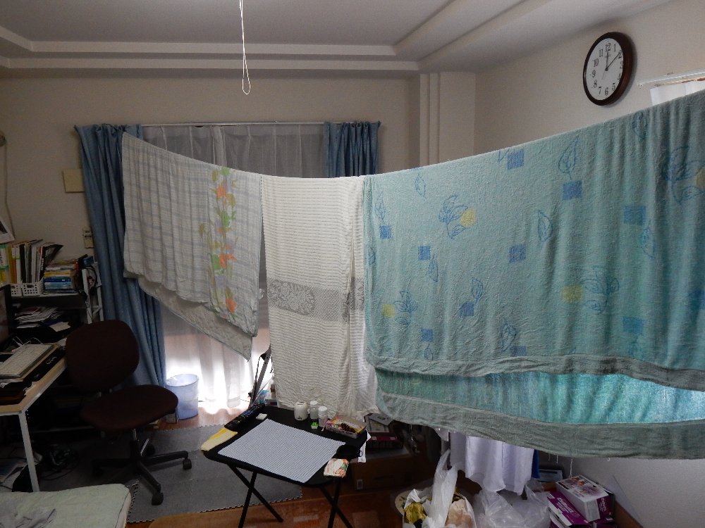 (追記)10時過ぎに、敷きシーツと、掛け布団(ブランケット)2枚を洗濯した。室内干しなので、こんな状態。