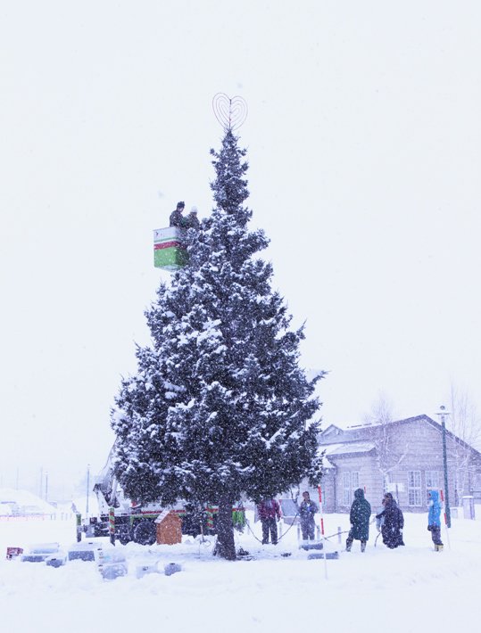 ハートツリーのイルミネーションの準備が、降り続く雪の中で行われています。