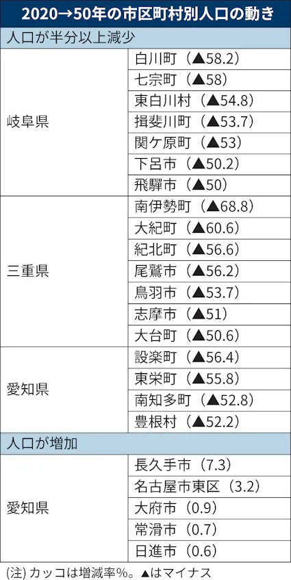 2023年12月22日 愛知・岐阜・三重県の人口、2050年に16%減 18市町村が半分以下に - 日本経済新聞 (nikkei.com)