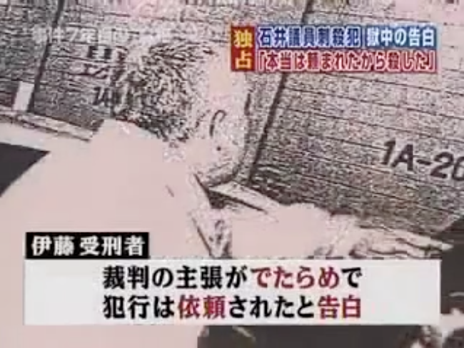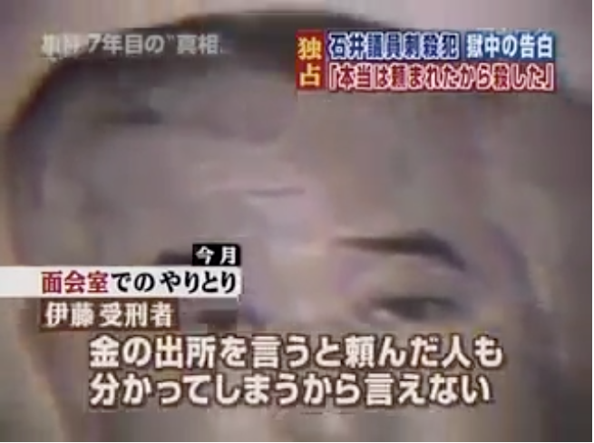 石井紘基議員刺殺事件 実行犯が告白「本当は頼まれたから殺した」 https://youtu.be/8gNf3gZ786gこれば事件から7年後、2009年のテレビ番組。
