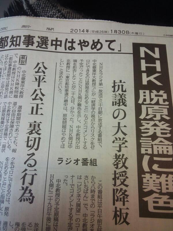 NHK脱原発論に難色「都知事選中はやめて」籾井新会長は就任会見で「国際放送で日本政府の意向を伝える」としており原発再稼働を強く打ち出している安倍政権の意向を忖度し、中北教授の脱原発のコメントは不適切だと判断したとも推測できる。tokyo-np.co.jp/s/article/2014…
