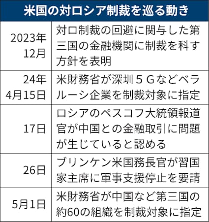 今後は中国側の出方が注目点となる。中国からロシアに向かう精密部品はデュアルユース(軍民両用)品が多く、中国当局はロシアへの軍事支援の事実を否定してきた。