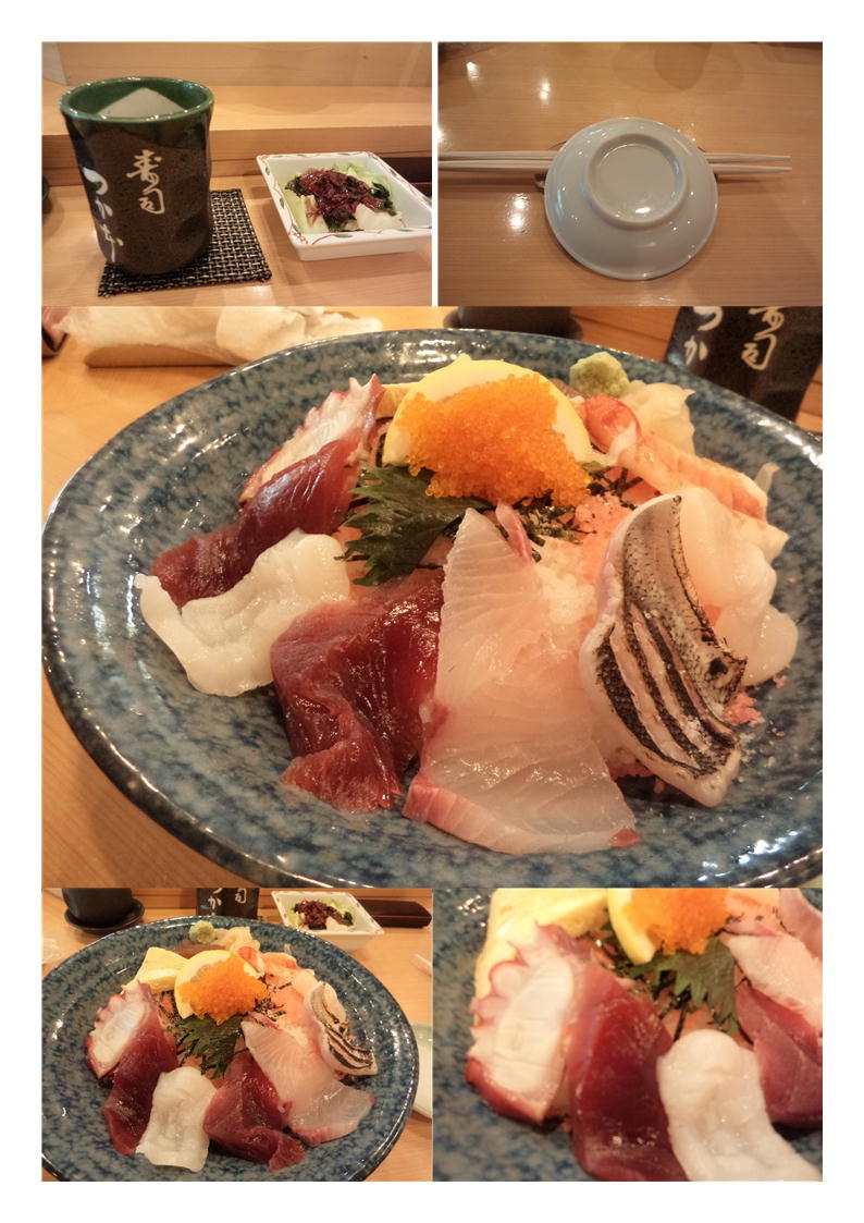 今日は2回目なので「ちらし」の定番にしてもらった。奈良漬け・かんぴょうが盛られているのが握との菜かもしれない。最後に、大葉が頂点にのせられ、トビッコが盛られれば終了らしい。なかなか見た目にはきれいである。➀②まぐろ③ボイル海老④げそ⑤帆立⑥たこ⑦玉子⑧ハマチとなっていた。