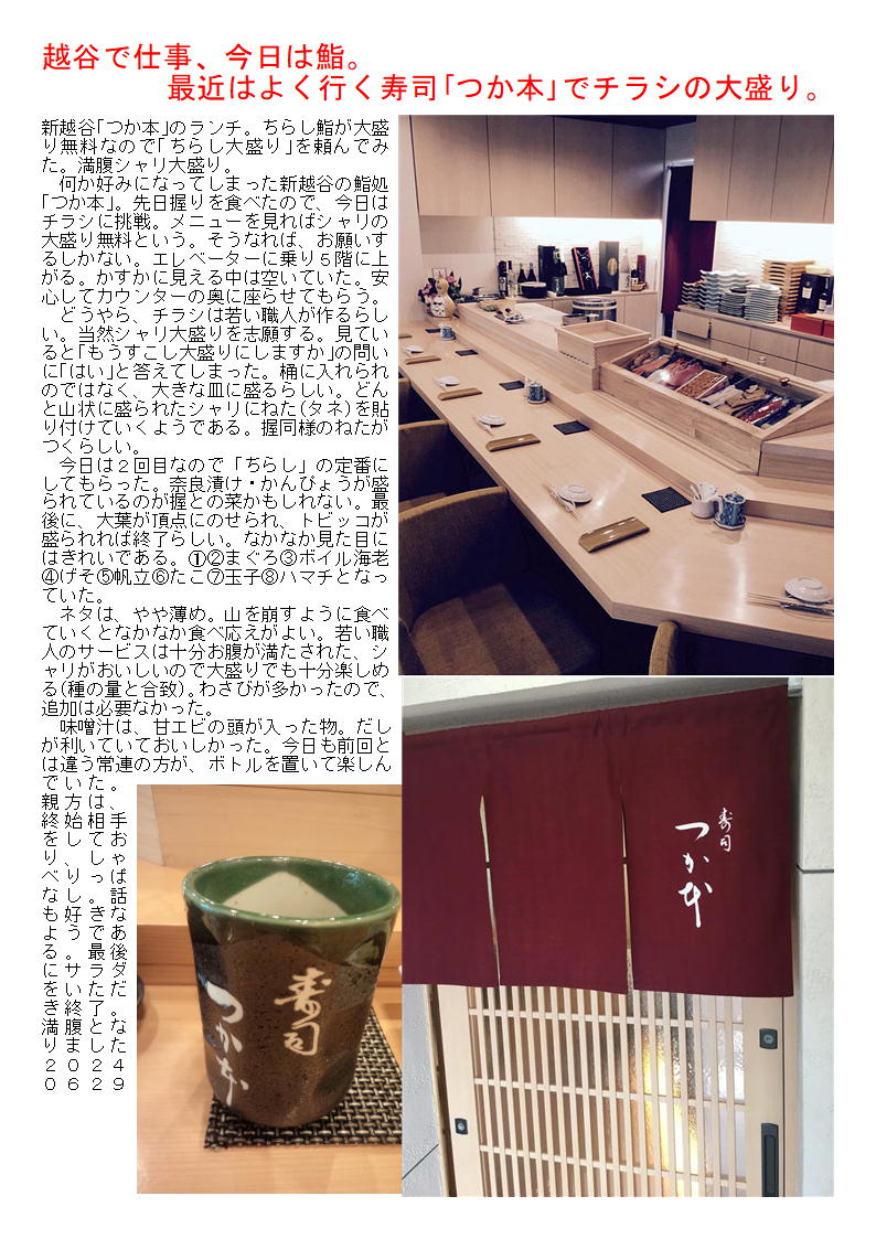 何か好みになってしまった新越谷の鮨処「つか本」。先日握りを食べたので、今日はチラシに挑戦。メニューを見ればシャリの大盛り無料という。そうなれば、お願いするしかない。エレベーターに乗り5階に上がる。かすかに見える中は空いていた。安心してカウンターの奥に座らせてもらう。