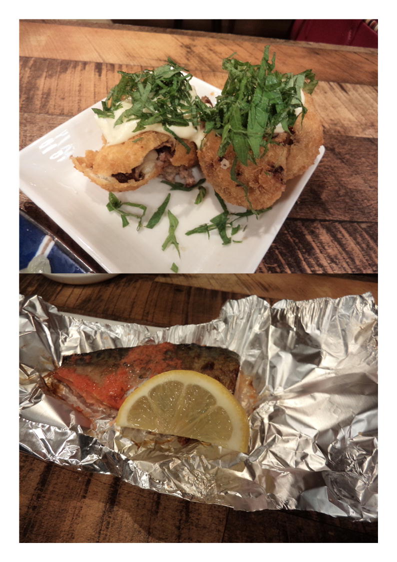まずは、多少のどが渇いていたので、ザービスの生ビールをいただき。つまみも考える。つまみは2人に任せたが、日本酒に合いそうな①魚(みりん付けホッケ)②椎茸の肉詰めフライ③漬物を注文した。時間も早いので、ほぼ貸し切り状態。おいしいものであり、日本酒とも相性は良かった(と思う「記憶が薄い」)。