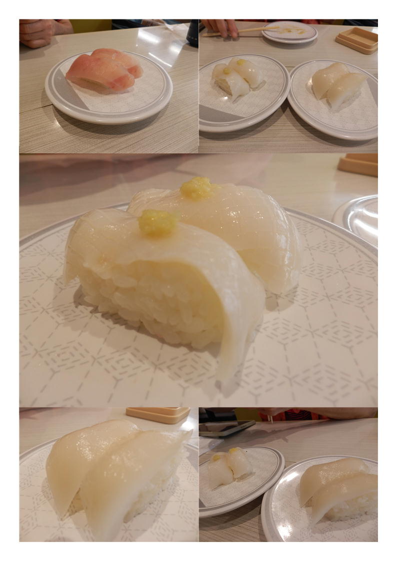まずは妻の注文から、①ビンチョウマグロが運ばれてきた。なかなか渥美もあるもの、妻の言葉を聞けば丁度良い状態という。きれいなネタだった。続いてイカシリーズ、②アオリイカ③ケンサキイカが動じに届いた。ちようどよい状態、ネタの大きさも十分。併せて私の頼んだ、④以下三昧(3種)も食べることになった。