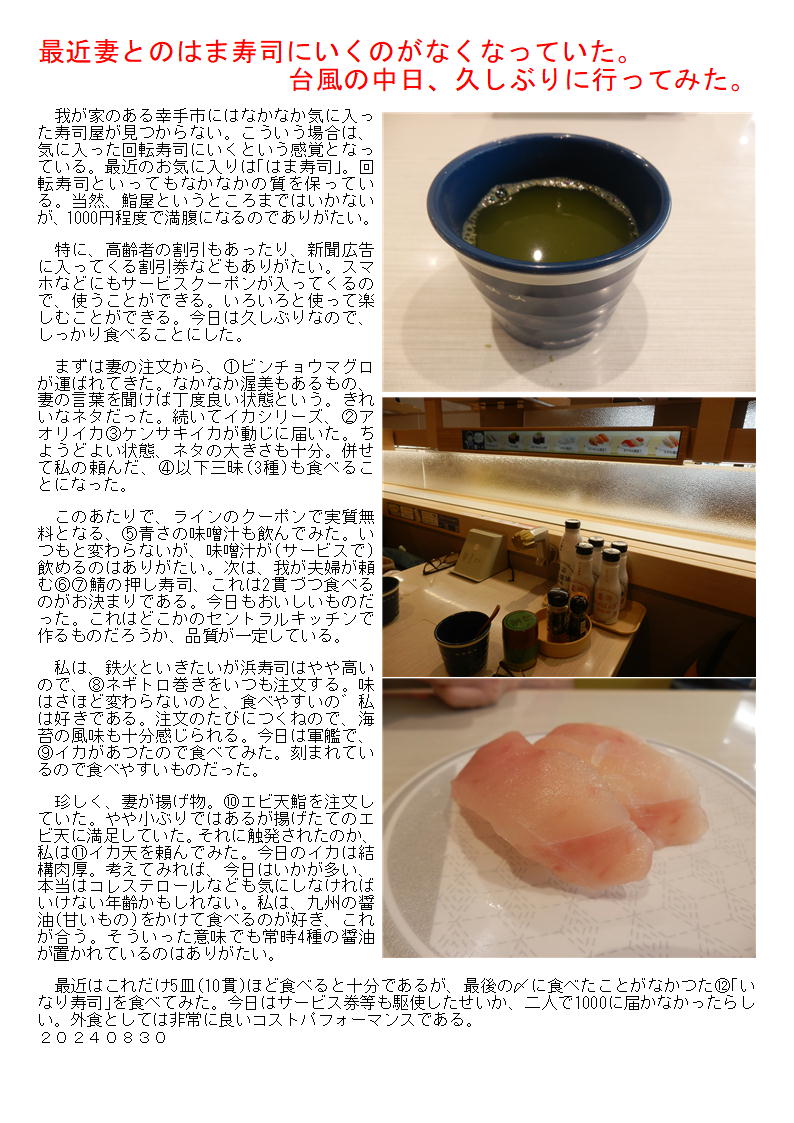 我が家のある幸手市にはなかなか気に入った寿司屋が見つからない。こういう場合は、気に入った回転寿司にいくという感覚となっている。最近のお気に入りは「はま寿司」。回転寿司といってもなかなかの質を保っている。当然、鮨屋というところまではいかないが、1000円程度で満腹になるのでありがたい。
