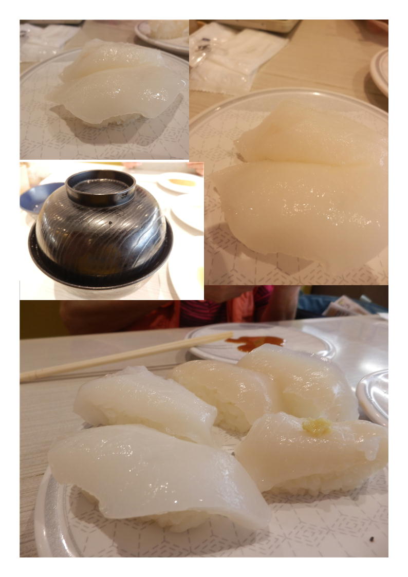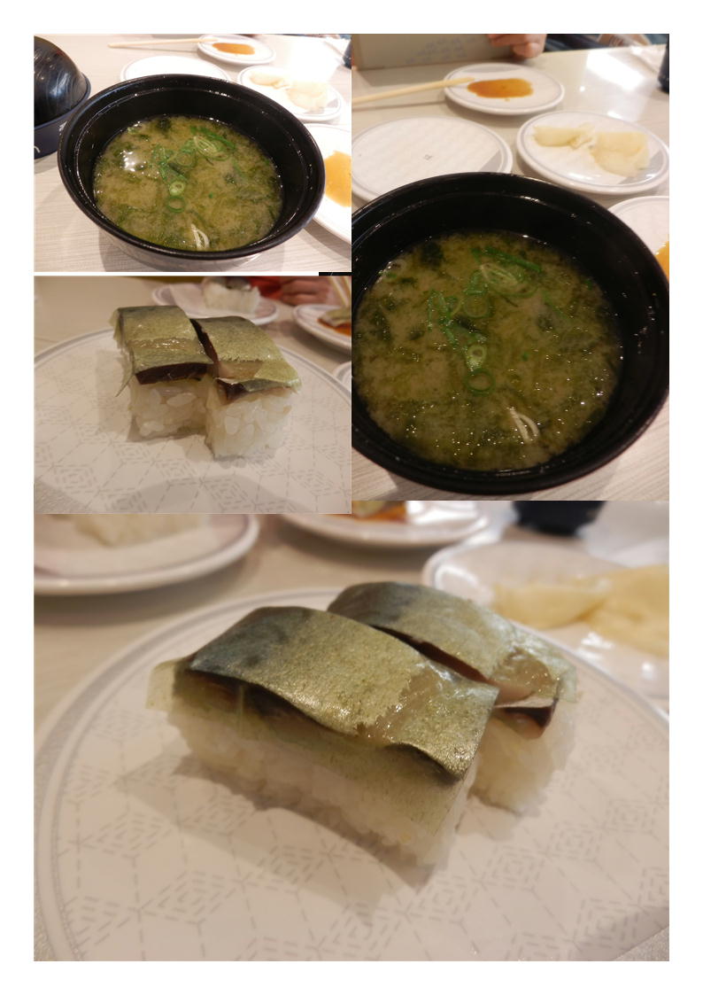 このあたりで、ラインのクーポンで実質無料となる、⑤青さの味噌汁も飲んでみた。いつもと変わらないが、味噌汁が(サービスで)飲めるのはありがたい。次は、我が夫婦が頼む⑥⑦鯖の押し寿司、これは2貫づつ食べるのがお決まりである。今日もおいしいものだった。これはどこかのセントラルキッチンで作るものだろうか、品質が一定している。