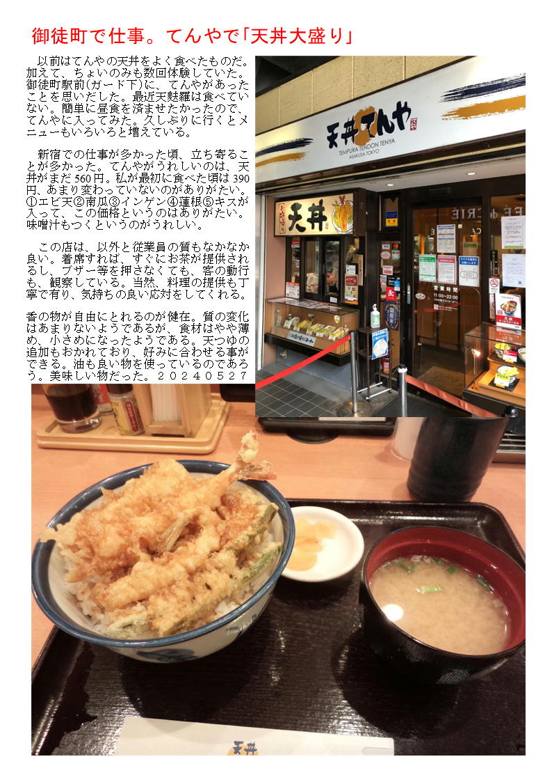 新宿での仕事が多かった頃、立ち寄ることが多かった。てんやがうれしいのは、天丼がまだ560円。私が最初に食べた頃は390円、あまり変わっていないのがありがたい。①エビ天②南瓜③インゲン④蓮根⑤キスが入って、この価格というのはありがたい。味噌汁もつくというのがうれしい。