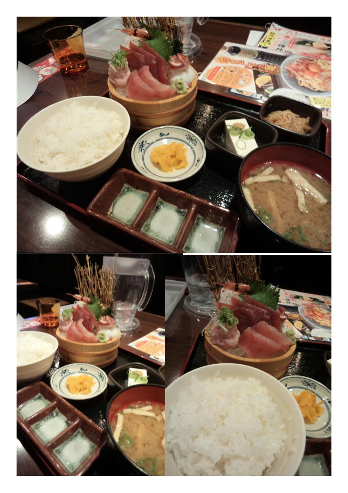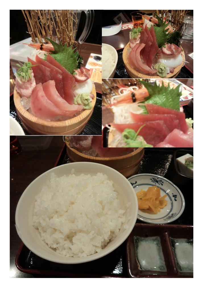 あまりランチは客が来ないのであろうか、若手の従業員が一人で切り盛りしている。動きは非常に良い。雰囲気からすると、厨房も一人かもしれない。10分ほどして、きれいに盛り付けられた(おけ盛り)ものである。刺身以外に、小鉢3種、①香の物(壷漬け)②冷や奴③切り干し大根がついていた。