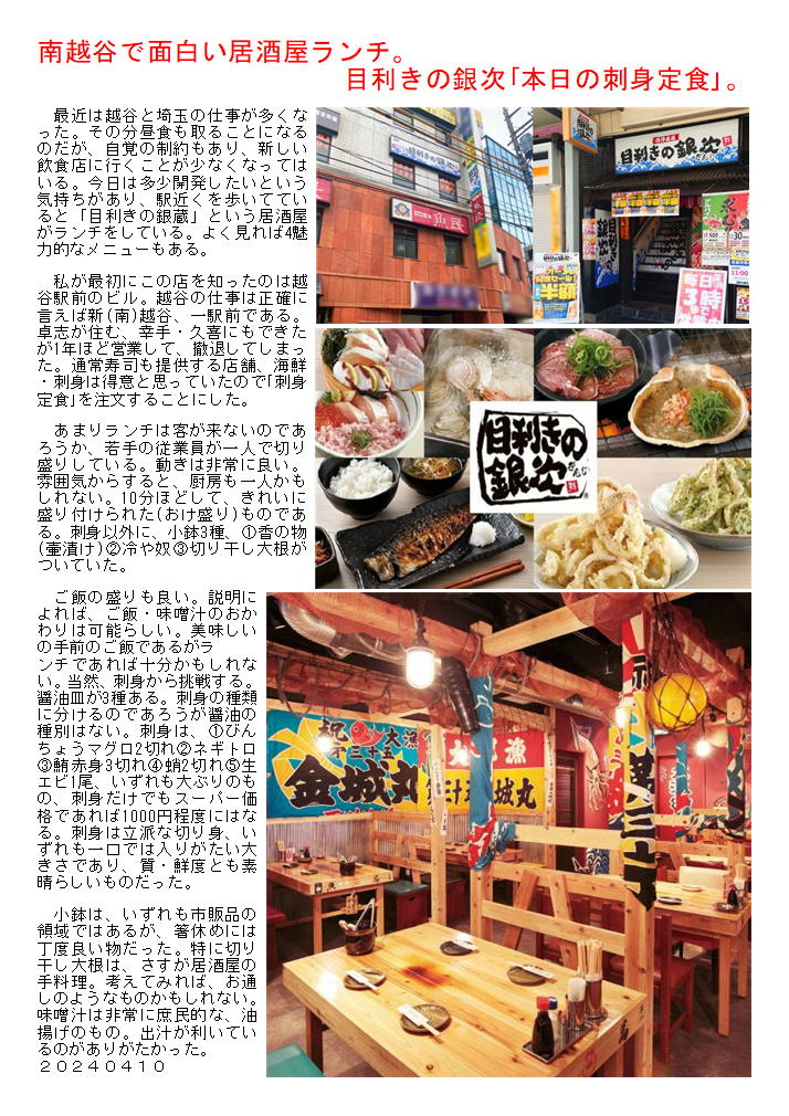最近は越谷と埼玉の仕事が多くなった。その分昼食も取ることになるのだが、自覚の制約もあり、新しい飲食店に行くことが少なくなってはいる。今日は多少開発したいという気持ちがあり、駅近くを歩いてていると「目利きの銀蔵」という居酒屋がランチをしている。よく見れば4魅力的なメニューもある。