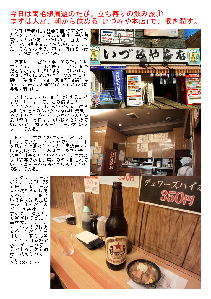 まずは大宮、朝から飲める「いづみや本店」で、喉を潤す。