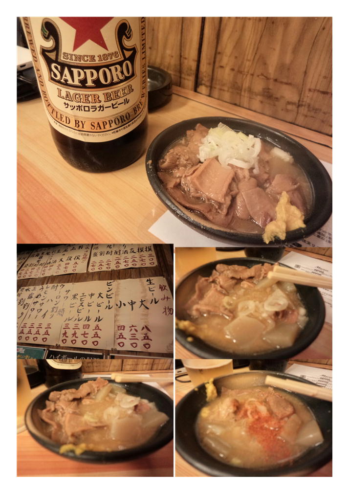 いずれにしても、昭和22年創業。私より古い。よくぞ、この価格このサービスでやってこれたものである。従業員野方も壮年の方が多いが非常に元気。やや価格は上がっている物の17のもつ煮は健在。今日はちょい飲みと決めていたので、「煮込み+瓶ビール大」のスタートである。