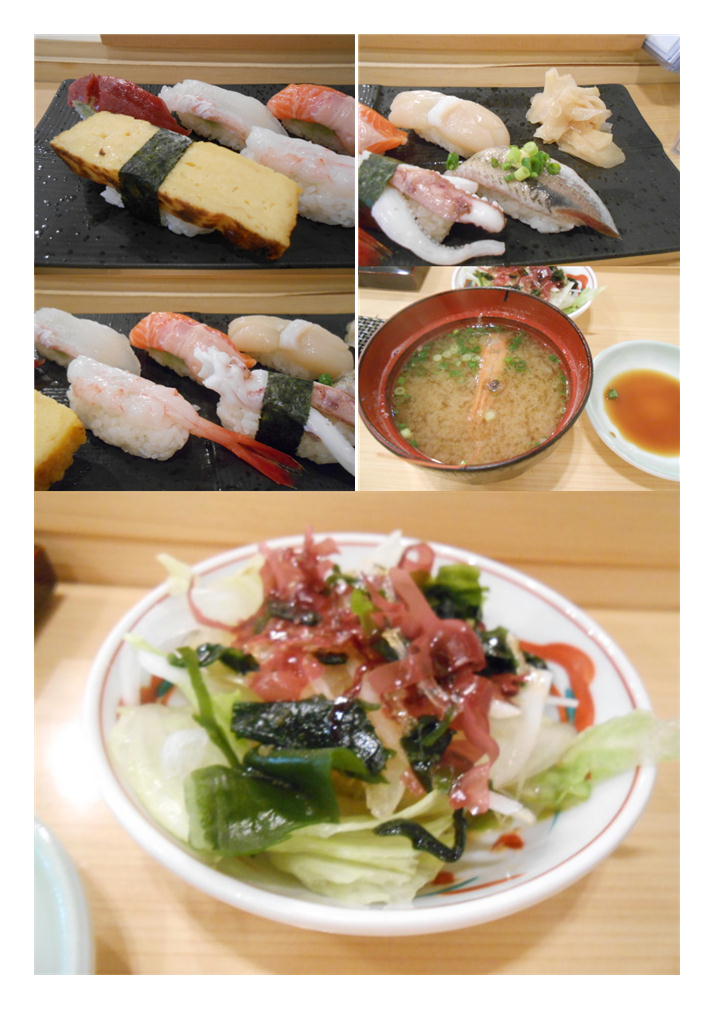 ➀まぐろ②たい③サーモン④帆立⑤たまご⑥甘エビ⑦げそ(イカ)⑧鰯のラインナップ。ネタは十分な物が提供されている。特に「鯛」は昆布締めをしているのだろうか風味があった。「帆立」は小ぶりではあるが、帆立の味は十分に出されていた。玉子も自家製であろう甘みが抑えられていた。