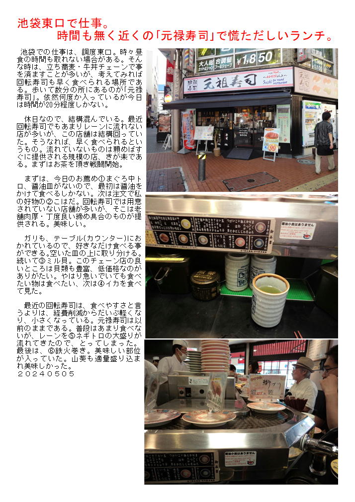 池袋での仕事は、調度東口。時々昼食の時間も取れない場合がある。そんな時は、立ち蕎麦・牛丼チェーンで事を済ますことが多いが、考えてみれば回転寿司も早く食べられる場所である。歩いて数分の所にあるのが「元禄寿司」。依然何度か入っているが今日は時間が20分程度しかない。