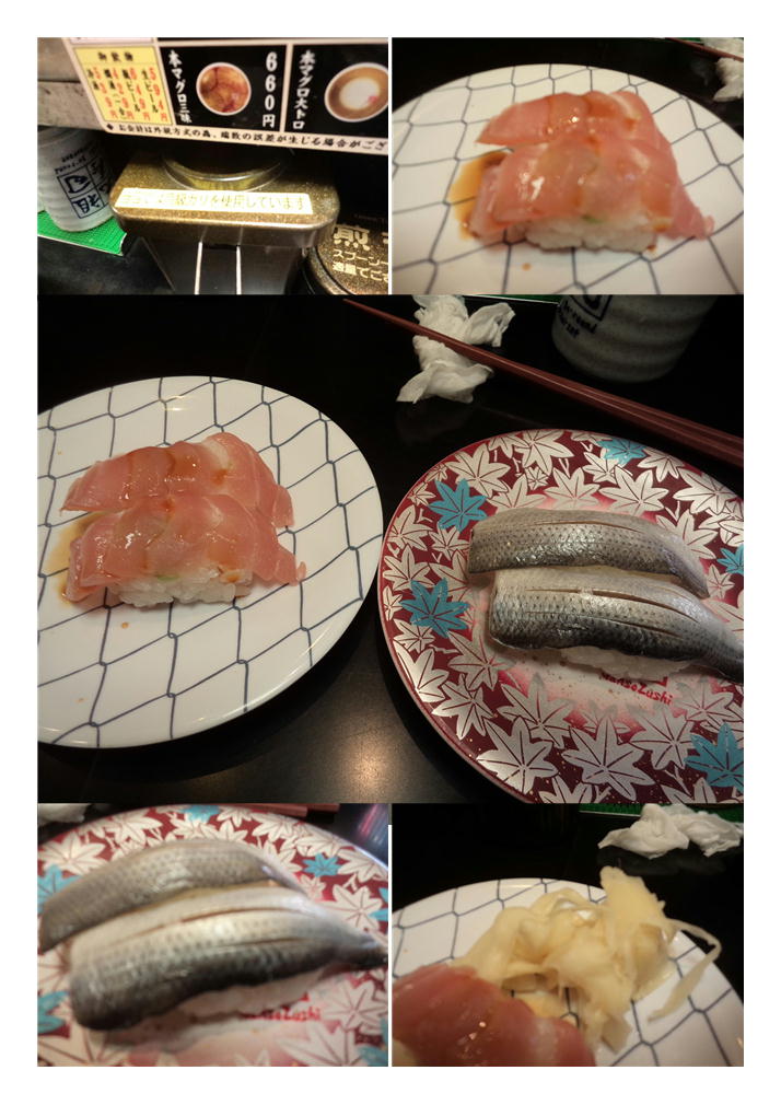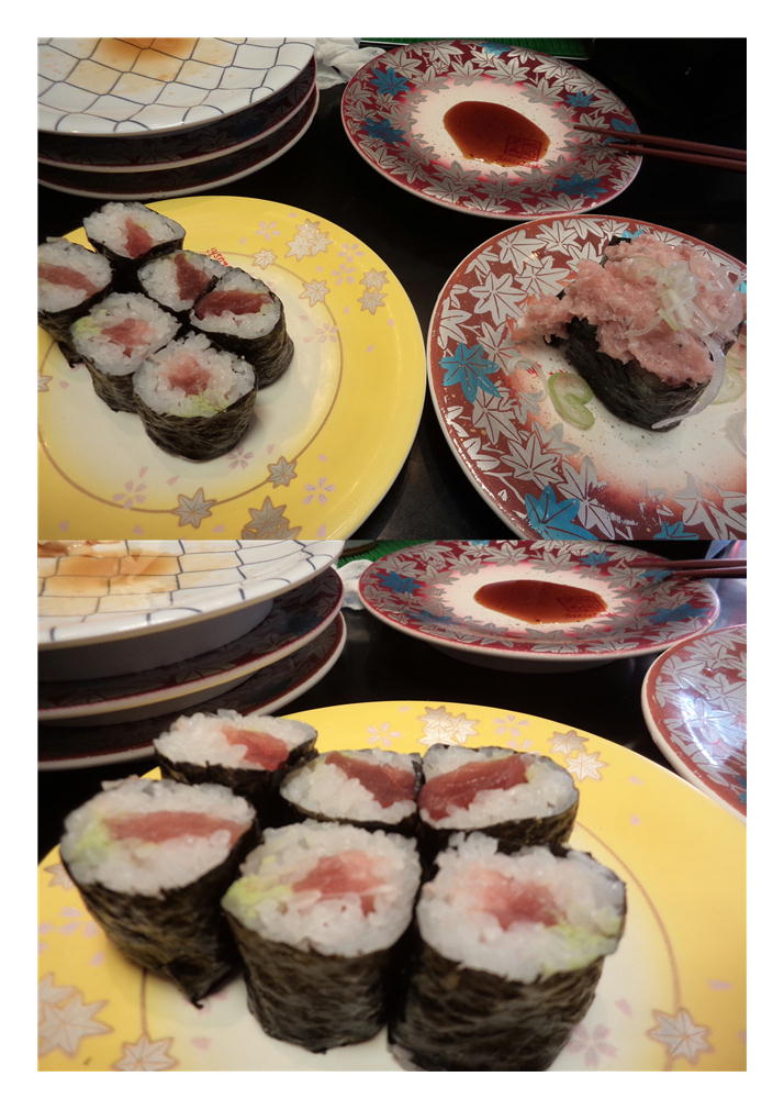 最近の回転寿司は、食べやすさと言うよりは、経費削減からだいぶ軽くなり、小さくなっている。元禄寿司は以前のままである。普段はあまり食べないが、レーンを⑤ネギトロの大盛りが流れてきたので、とってしまった。最後は、⑥鉄火巻き。美味しい部位が入っていた。山葵も適量盛り込まれ美味しかった。