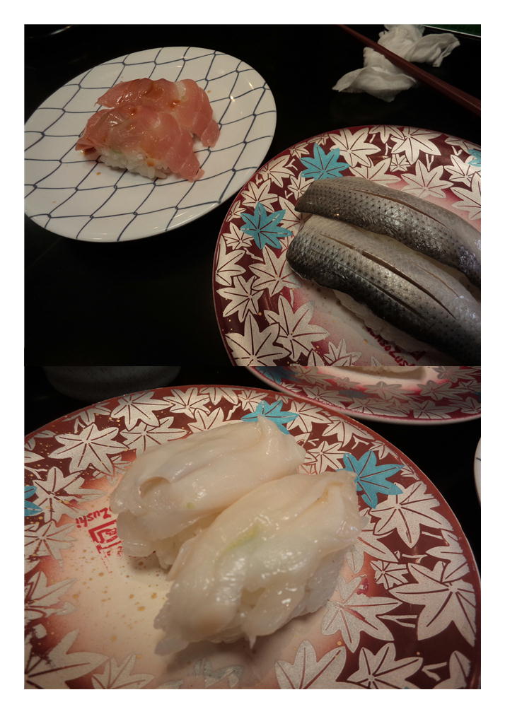 まずは、今日のお薦め①まぐろ中トロ、醤油皿がないので、最初は醤油をかけて食べるしかない。次は注文で私の好物の②こはだ。回転寿司では用意されていない店舗が多いが、そこは老舗肉厚・丁度良い締め具合のものが提供される。美味しい。
