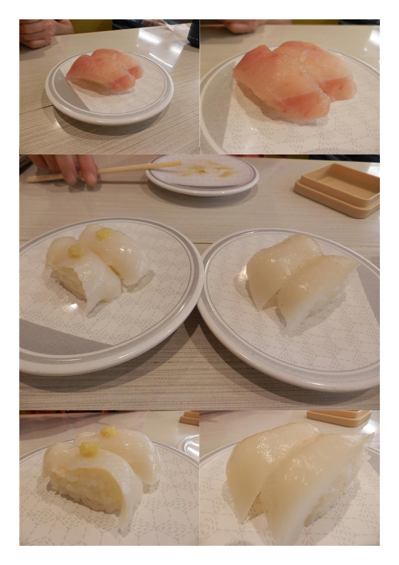 まずは妻の注文から、①ビンチョウマグロが運ばれてきた。なかなか渥美もあるもの、妻の言葉を聞けば丁度良い状態という。きれいなネタだった。続いてイカシリーズ、②アオリイカ③ケンサキイカが動じに届いた。ちようどよい状態、ネタの大きさも十分。併せて私の頼んだ、④以下三昧(3種)も食べることになった。