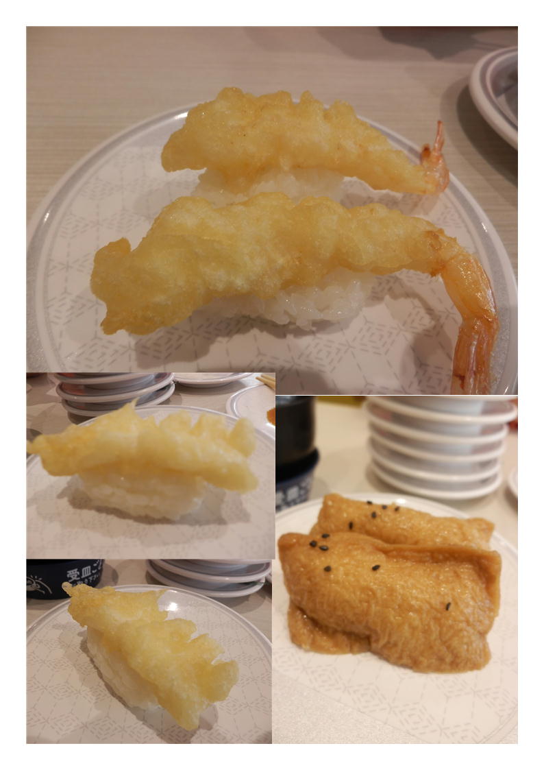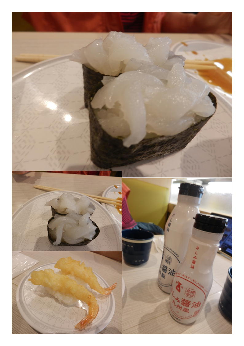 珍しく、妻が揚げ物。⑩エビ天鮨を注文していた。やや小ぶりではあるが揚げたてのエビ天に満足していた。それに触発されたのか、私は⑪イカ天を頼んでみた。今日のイカは結構肉厚。考えてみれば、今日はいかが多い、本当はコレステロールなども気にしなければいけない年齢かもしれない。私は、九州の醤油(甘いもの)をかけて食べるのが好き、これが合う。そういった意味でも常時4種の醤油が置かれているのはありがたい。