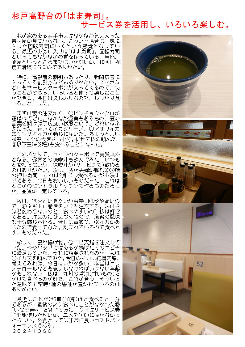 我が家のある幸手市にはなかなか気に入った寿司屋が見つからない。こういう場合は、気に入った回転寿司にいくという感覚となっている。最近のお気に入りは「はま寿司」。回転寿司といってもなかなかの質を保っている。当然、鮨屋というところまではいかないが、1000円程度で満腹になるのでありがたい。