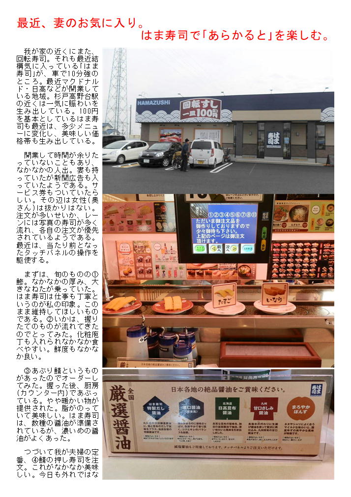 我が家の近くにまた、回転寿司。それも最近結構気に入っている「はま寿司」が、車で10分強のところ。最近マクドナルド・日高などが開業している地域。杉戸高野台駅の近くは一気に賑わいを生み出している。100円を基本としているはま寿司も最近は、多少メニューに変化し、美味しい価格帯も生み出している。